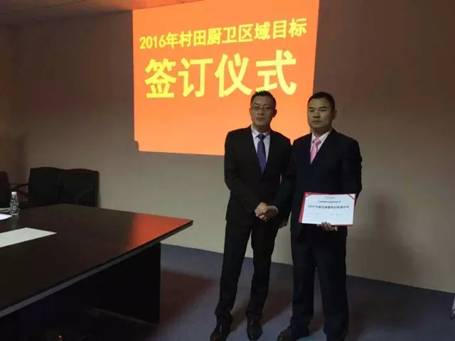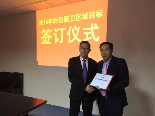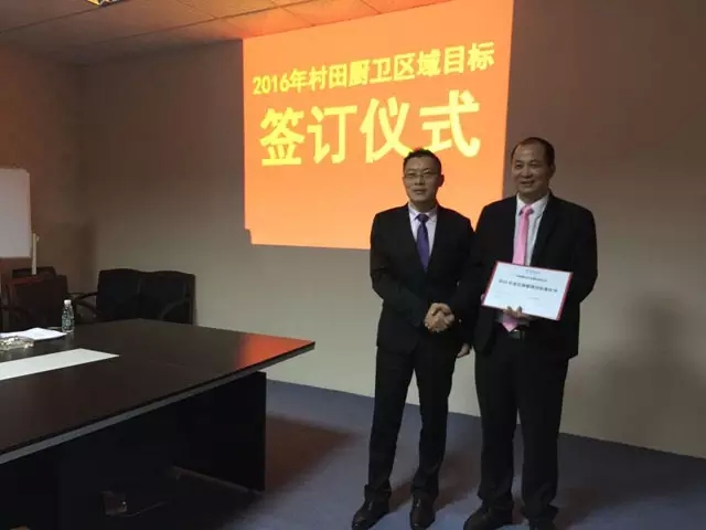 圖為村(cūn)田營銷中南大區總監夏玉波與廖總簽約、握手、合影