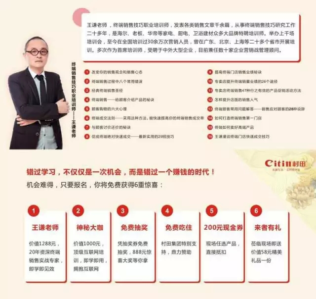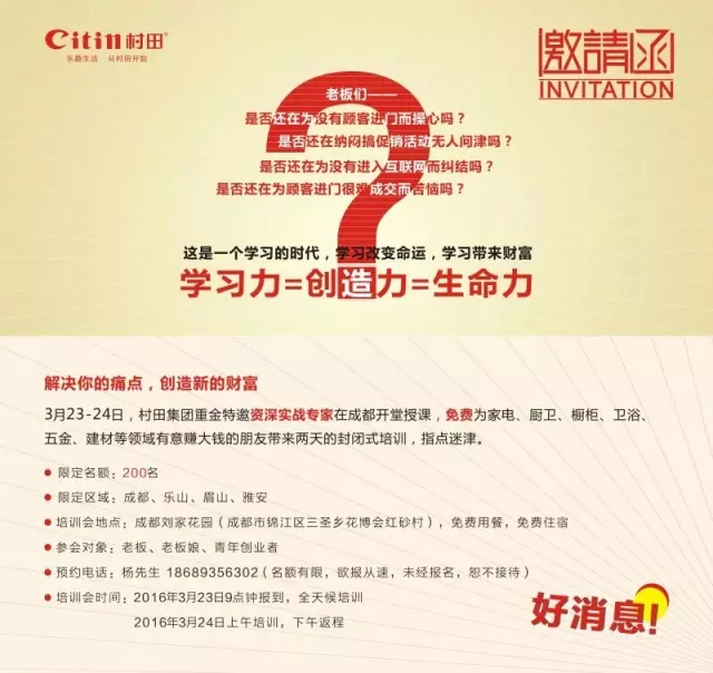 親,福利來了,絕對爆(bào)棚!成都,3月(yuè)23-24日,由17.C1起草视频集團主(zhǔ)辦,特邀移動(dòng)互(hù)聯網大咖及20餘年資深終端銷售實戰專(zhuān)家王謙(qiān)老師帶來2天1夜(yè)“互聯網+贏在終(zhōng)端”培訓(xùn),即學(xué)即用,限定(dìng)名額:200名,免學(xué)費/免吃住/抽(chōu)大獎,錯(cuò)過一次,後悔(huǐ)一年。預(yù)約(yuē):楊先(xiān)生 18689356302。